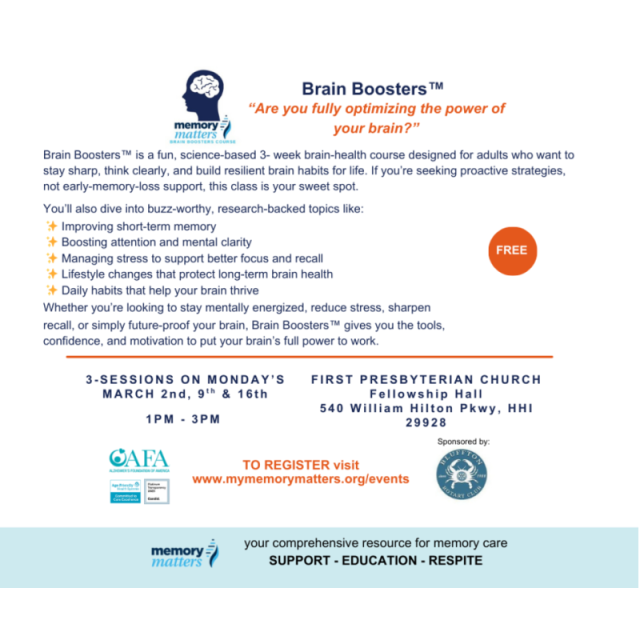 Brain Boosters is a fun, science-based 3- week brain-health course designed for adults who want to stay sharp, think clearly, and build resilient brain habits for life. If you're seeking proactive strategies, not early-memory-loss support, this class is your sweet spot. You'll also dive into buzz-worthy, research-backed topics like: