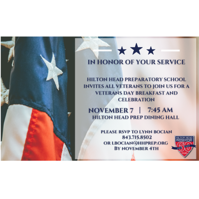 Hilton Head Preparatory School invites all Veterans to join us for a Veterans Day Breakfast and Celebration on November 7 at 7:45 AM. The event will take place in the Hilton Head Prep Dining Hall. Breakfast will be served, guests will hear from a variety of speakers, and enjoy musical numbers from our students. Please RSVP to Lynn Bocian at 843-715-8502 or [email protected] by November 4th.