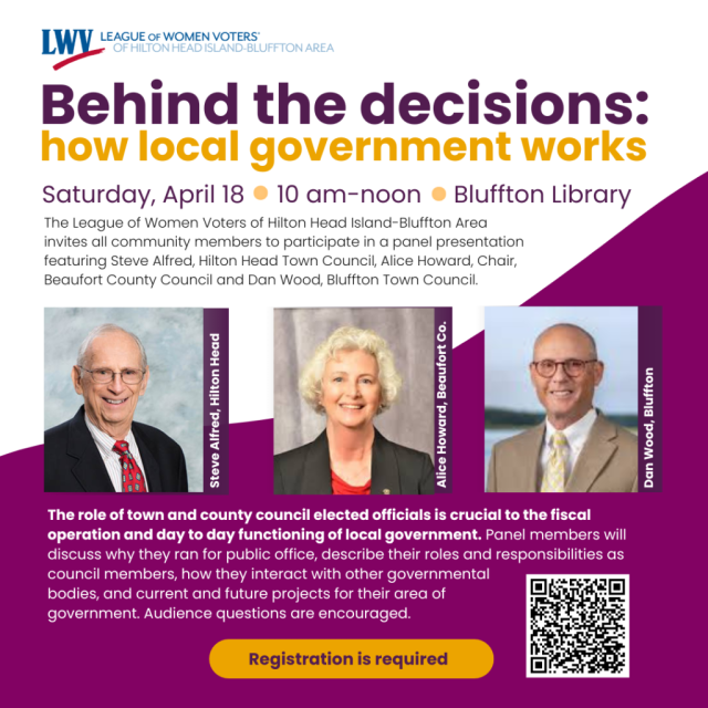 The League of Women Voters of Hilton Head Island-Bluffton Area invites all community members to participate in a panel presentation featuring Steve Alfred of the Hilton Head Town Council, Alice Howard of the Chair Beaufort Council, and Dan Wood of the Bluffton Town Council.