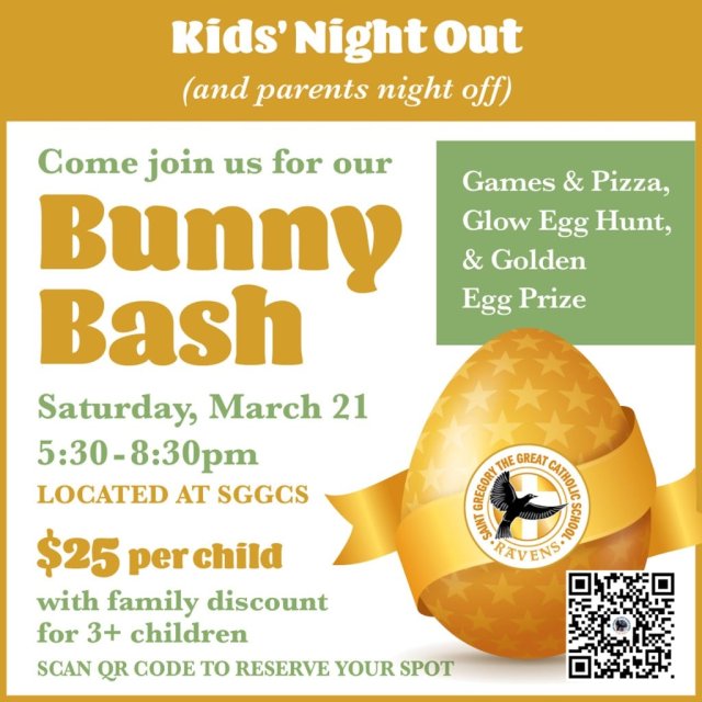 Join us for Bunny Bash, an Easter-themed Kids' Night Out in the school library. The evening includes games, crafts, music, pizza, and a glow-in-the-dark egg hunt your child won't want to miss. One lucky Bunny will also win our Golden Egg Prize. It's a safe, supervised night with friends, perfect for a parents' night out, and all proceeds support the Easter Bunny Hop 5K.