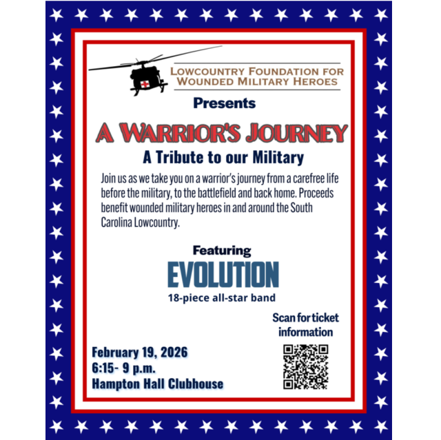 On February 19th, the Lowcountry Foundation for Wounded Military Heroes and the Evolution Big Band Community Support Fund invite you to join them for an emotional, yet entertaining, evening as they pay tribute to our military and take you on a Warrior's journey -- through music -- from a carefree life before the military, to the battlefield, and back home.